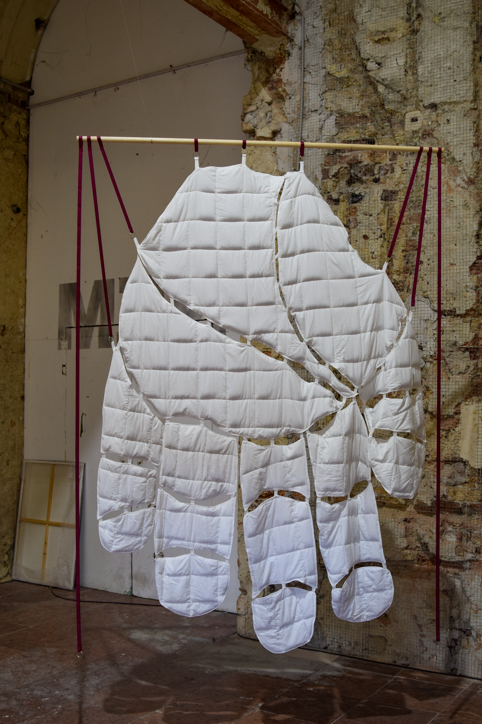 Her practice combines many artistic disciplines, including installation, sound, sculpture, text, film and performance. Drawing on her own lived experience and using her own voice and language, she dismantles structures and patterns in works to which the body is always central. In the textile and performance pieces in the exhibition the artist explores interdependence, societal institutions and touch hunger, and how this affects our bonding abilities, political landscape and more.